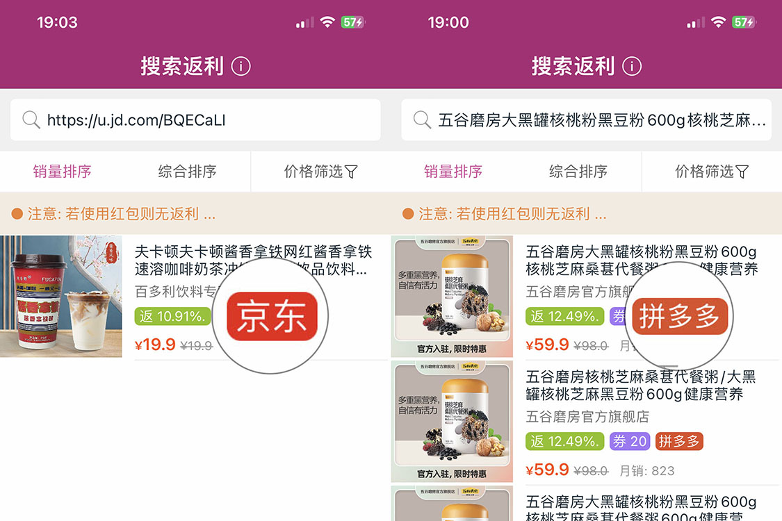 4. 百宝袋可以搜索拼多多, 京东的商品信息. 搜索关键词会同时出现淘宝, 拼多多和京东的商品, 方便比价和购买.