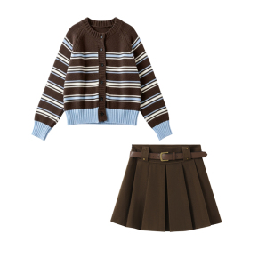 【蜜蜂欢乐社】秋冬穿搭一整套女条纹针织开衫排扣半身裙两件套装