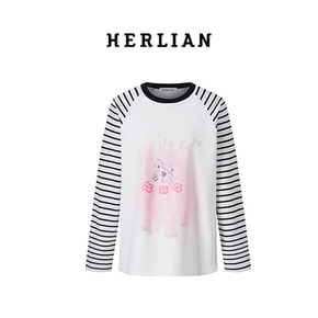 HERLIAN 新品女士狗狗印花拼接条纹长袖T恤