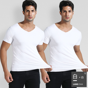 【优惠价】浪莎冰丝无痕短袖男士莫代尔棉汗衫t恤夏季v领白色弹力背心打底