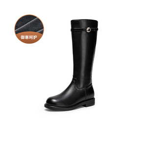 【优惠价】千百度中跟粗跟骑士靴女2025冬季新款加绒保暖高筒长靴时尚瘦