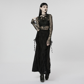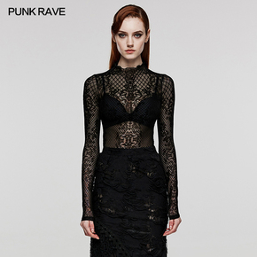 秋冬新款哥特女装植绒T恤高领长袖黑色蕾丝衫紧身显瘦上衣打底衫