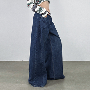 尢系UXI 早秋复古拼接设计休闲宽松显瘦直筒阔腿牛仔裤(送腰带)