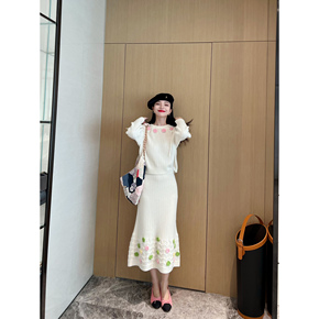 NancyCavally繁花绽放 手勾羊毛花露肩麦穗针织毛衣/鱼尾半裙
