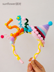 ins风生日头饰甜美可爱儿童扭扭发夹公主纱网宝宝彩色毛球生日帽