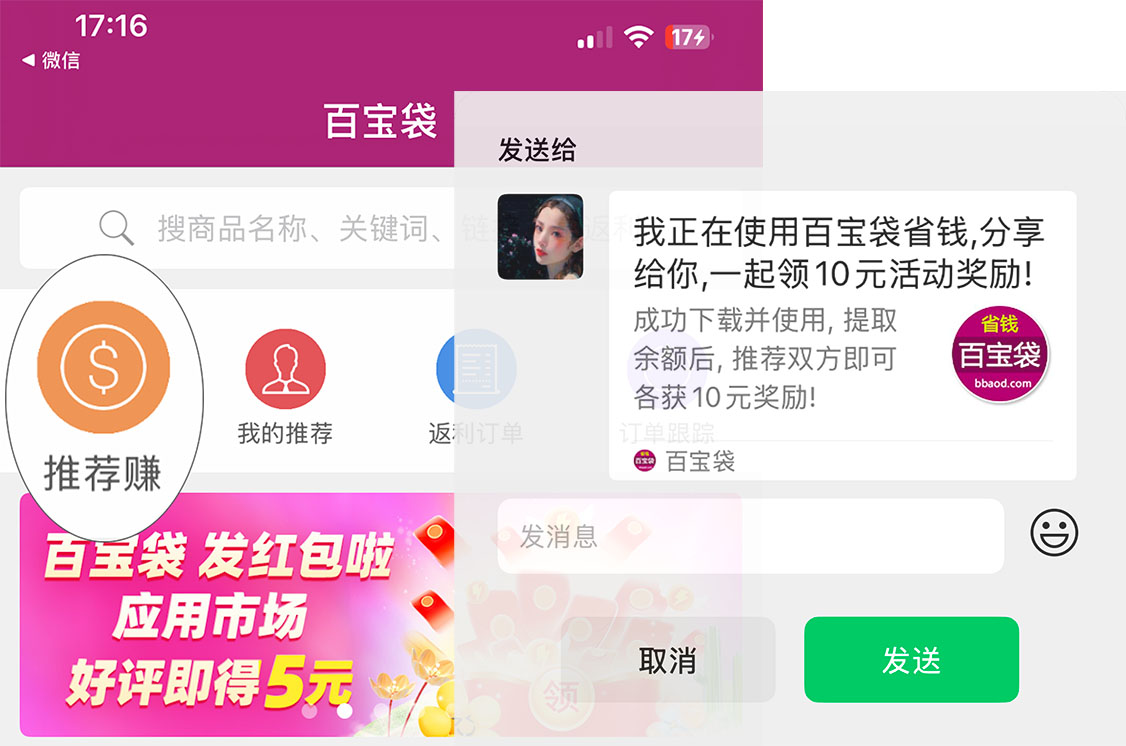 1. 点击百宝袋APP首页, 推荐赚 按钮; 分享百宝袋到微信.