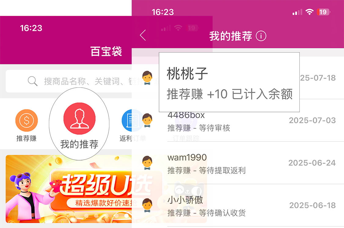 2. 推荐人点击百宝袋APP首页, 我的推荐 按钮; 查看被推荐人状态. (有显示昵称,说明推荐成功)