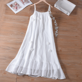 法式立体花朵连衣裙女夏季白色吊带可扎染海边度假风过膝大摆长裙