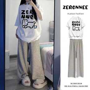 休闲运动套装女夏季新款韩版学生宽松短袖T恤+条纹阔腿裤两件套潮