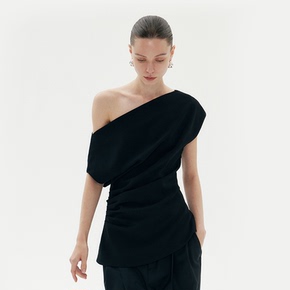 novita女装松弛感一字领OL风露肩褶皱纯色气质收腰正肩上衣T恤