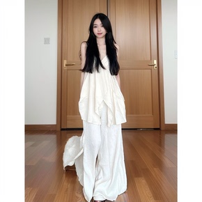 慵懒风休闲套装夏季宽松V领吊带上衣低腰拖地感阔腿裙裤两件套女