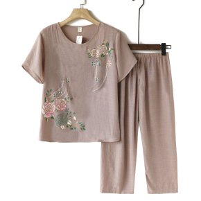 薄款丝麻两件套衣服夏季60老年妈妈休闲短袖女70太婆套装80岁奶奶