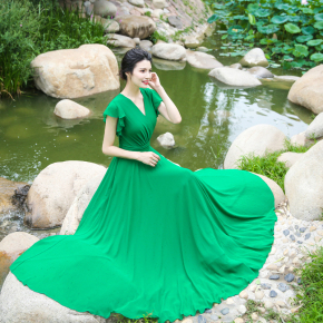 气质大摆长款雪纺修身连衣裙海边度假旅游拍照高级感长袖沙滩裙夏