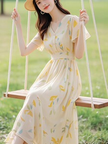 法式超好看连衣裙女夏季2025新款收腰海边度假碎花小飞袖雪纺长裙
