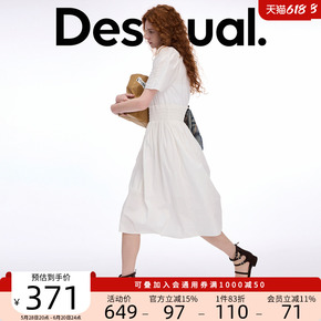Desigual高腰针梭织拼接司马克橡筋收腰圆领白色连衣裙
