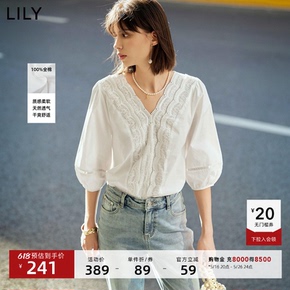 LILY2025夏新款女装法式重工花边V领全棉白色泡泡袖套头雪纺衫