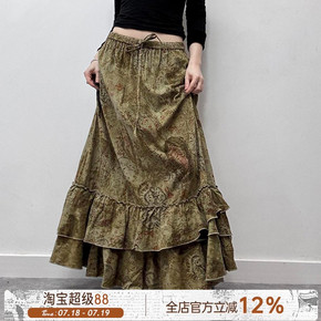 ROCKMORE【森系vintage】复古印花系带松紧腰半身裙木耳边A