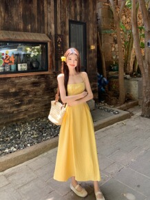 温柔风黄色吊带连衣裙女夏季法式气质收腰显瘦A字裙海边度假长裙