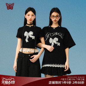kblc美式甜酷蝴蝶结立体蕾丝印花短袖t恤女潮牌夏季宽松少女上衣