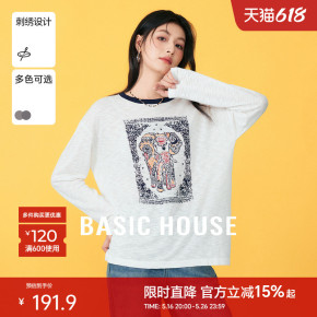 Basic House/百家好卡通刺绣撞色套头针织衫小个子减龄宽松上衣