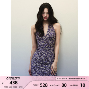 1P STUDIO 深紫色米黄碎花挂脖连衣裙女夏季收腰露背V领无袖短裙