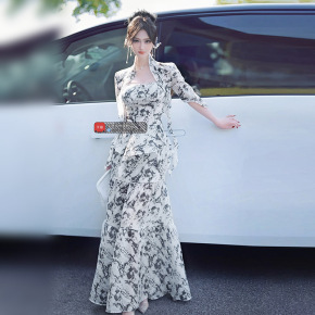 新中式吊带印花连衣裙荷叶边罩衫两件套度假风印花长裙套装