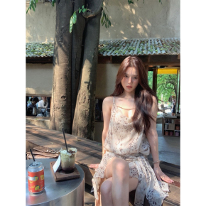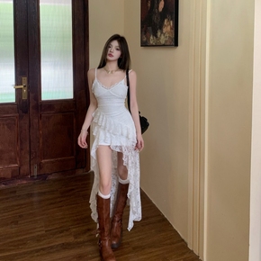 法式蕾丝v领吊带连衣裙女夏季度假不规则裙子白色绝美收腰中长裙