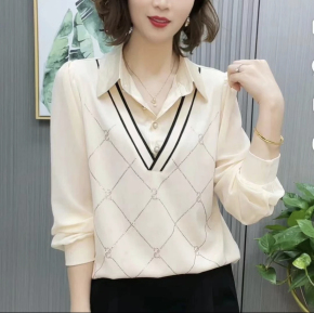 妈妈装衬衫领洋气拼色假两件打底衫时尚女春长袖T恤减龄百搭上衣