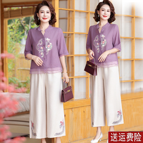 年轻妈妈夏装棉麻套装新中式国风短袖小衫中老年人女装夏季上衣服