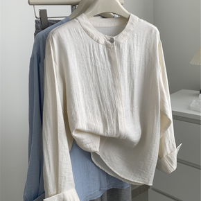 气质韩版仿麻手感圆领衬衫女宽松休闲垂感贝壳扣防晒衬衣2025春夏