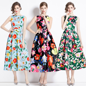 欧洲站明星款气质名媛走秀礼服彩色长裙法式英伦风大花无袖连衣裙