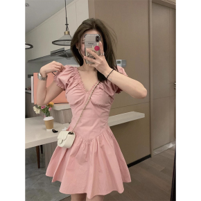 Veee初夏甜茶 粉色显瘦V领泡泡袖设计感褶皱辣妹短款法式连衣裙