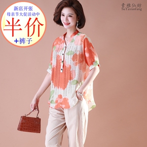 妈妈夏装棉麻套装2025新款中老年女夏季短袖上衣中年洋气两件套薄