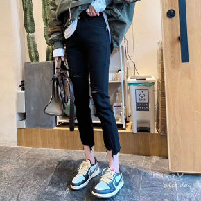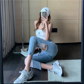 设计感前后破洞牛仔裤女夏季薄款2024年新款高腰直筒修身九分小脚