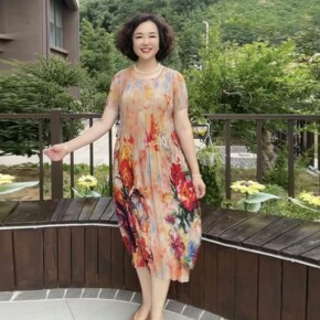 夏季连衣裙2025新款中老年妈妈真丝褶皱薄款裙子中长款粉色宽松版