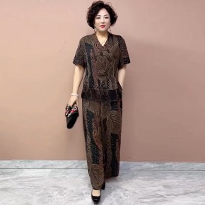 中老年妈妈夏季真丝套裤宽松加肥加大码显瘦上衣高腰阔腿裤两件套