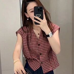 复古格子v领无袖衬衫2024新款女夏季宽松拼色衬衣气质小飞袖上衣
