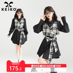 KEIKO 韩系格纹系带假两件衬衫连衣裙25春季肌理感收腰显瘦a字裙