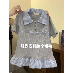 蝴蝶结格纹拼接polo领短袖t恤女2025新款夏季学院风修身短款上衣