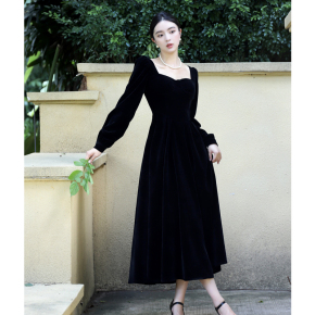 秋冬季新款赫本风连衣裙高级感气质长袖显瘦黑色金丝绒法式裙子女