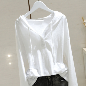 白色连帽长袖t恤女2024春秋新款宽松显瘦竹节棉内搭打底衫上衣潮