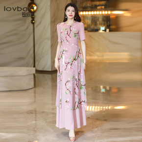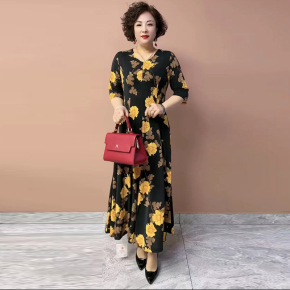 2025春夏新款高档阔太太气质花色弹力大码妈妈装加长款大摆裙子女