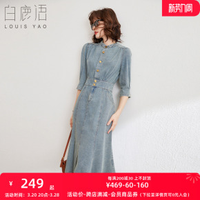 白鹿语立体小翻领牛仔裙2025春季新款复古纽扣收腰鱼尾裙摆连衣裙