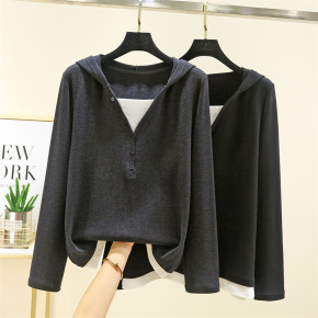 外穿德绒假两件连帽上衣女秋冬加绒加厚保暖打底衫长袖内搭T恤衫