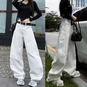 高街潮酷个性拼接洗水牛仔裤女秋百搭遮肉宽松显瘦弯刀休闲阔腿裤