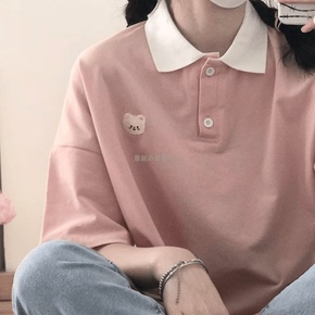 学院日系减龄少女可爱小熊休闲宽松短袖polo领T恤polo衫校服学生