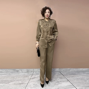中国风妈妈装真丝两件套夏季新款中袖开衫上衣直筒裤大码洋气套裤