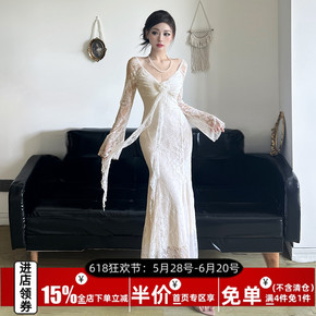AOMR法式立体花朵飘带长袖礼服连衣裙女纯欲蕾丝收腰显瘦鱼尾长裙