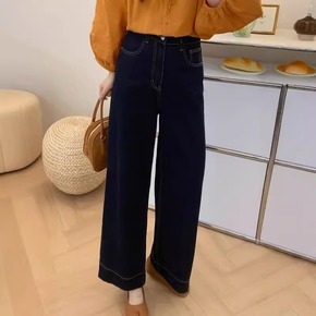 秋季新款深蓝色加绒直筒牛仔裤女大码胖mm梨形身材显瘦宽松阔腿裤