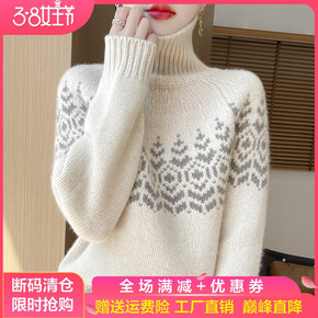 100%纯羊毛衫女高领提花加厚针织毛衣复古拼色宽松羊绒衫打底上衣